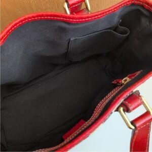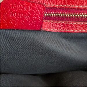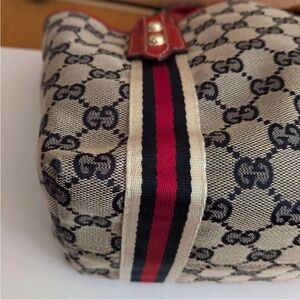 Chic Gucci tote with iconic pattern. Red accents add flair. Ideal for everyday use.