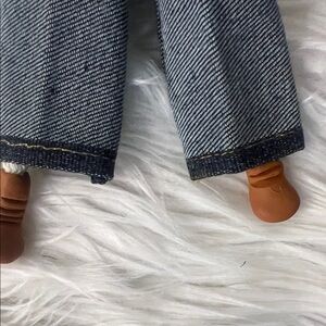 Charming handmade doll featuring a yellow scarf and denim pants. Perfect for collectors or as a unique gift.