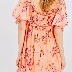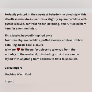 Perfectly printed in the sweetest babydoll-inspired style, this effortless mini dress features a slightly square neckline with puffed sleeves, contrast ribbon detailing, and ruffled bottom hem for a femme finish.
