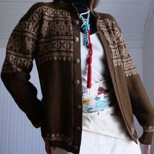 100% wool, sweet cabin embossed metal buttons up the front, dark brown base with Norwegian style tan pattern, boxy shape, made in Neenah, WI