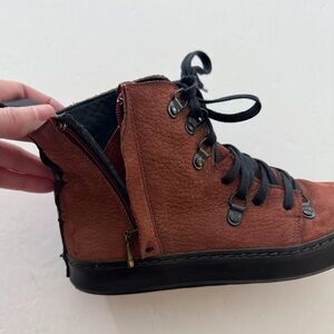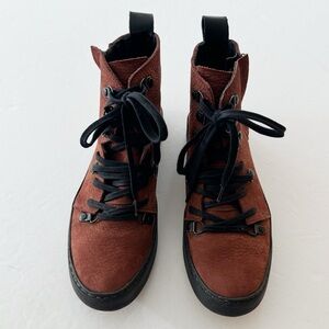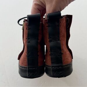 Bestias XX suede leather lace-up shoes. Red clay color. Black leather trim down the back of ankle and rubber soles. Side ankle zipper for easy on/off. Excellent used condition. Bestias is a shoe brand from Santiago, Chile. I do not have the original box. Feel free to ask any questions. EU 37, shaft 4”.