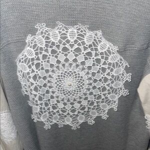 Chic gray and cream shirt with textured design. Features button-up style and unique fabric blend.