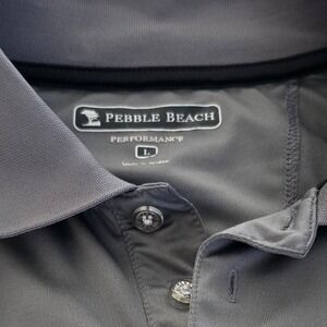Pebble Beach Performance men's gray short sleeve polo shirt. Features a collared neckline with a two-button placket and subtle contrast stitching along the hem and sleeves. The tag indicates size L.