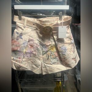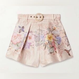 Elegant high waist shorts by Zimmermann. Features a floral pattern with a stylish belt. Perfect for a chic look.