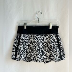 Lululemon, Pace Rival Skirt II, athletic skort, running skirt, tennis skirt, golf skirt, activewear, sportswear, workout gear, exercise, gym, black and white, animal print, zebra print, abstract, discontinued, rare find, sold out, Swift Ultra, Luxtreme liner, built-in shorts, pockets, high-rise,