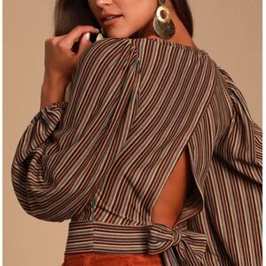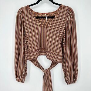 Free People striped V neck long sleeve cropped top. This stylish top features a flattering V-neckline, voluminous long sleeves with elasticized cuffs, and a chic tie-waist detail for a customizable fit. The all-over stripe pattern adds a touch of retro flair.