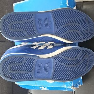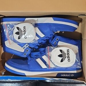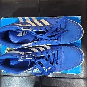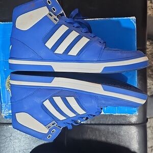 Bold blue high-tops with classic white stripes. Comfortable and stylish for everyday wear.