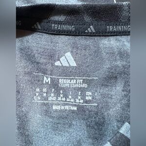 adidas women’s sleeveless training tank in black/gray abstract camo print. Lightweight, breathable performance fabric with racerback-style cut—perfect for workouts, gym, or athleisure wear.