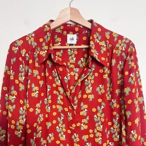 CAbi Belfry popover blouse featuring a vibrant red base with an allover floral print. Designed with a relaxed fit, partial button placket, classic collar, and long sleeves with button cuffs. Lightweight and flowy fabric makes it perfect for casual chic or preppy styling. Easy to dress up or down with denim, trousers, or skirts.