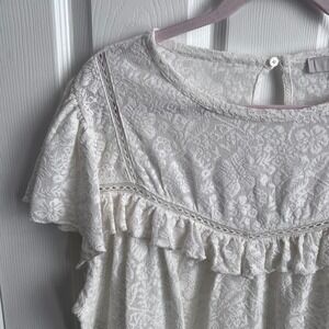 Keywords: lace top, ruffle trim, flutter sleeve, ivory blouse, textured, floral pattern, keyhole back, feminine, casual top, summer blouse, lightweight top, boho style, daytime wear