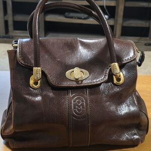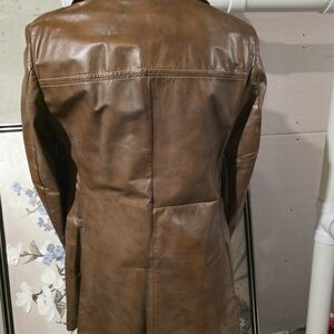 Step out in style with this tan leather double-breasted trench coat. Its sleek design offers a sophisticated look for any occasion.