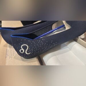 Elegant dark blue slip-ons with a textured design. Features subtle decorative accents.