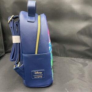 Vibrant Loungefly backpack featuring a Disney theme. Blue and purple hues with colorful aquatic design. Includes matching wallet.