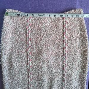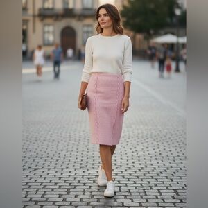 ✨ A refined St. John Couture knit pencil skirt, crafted in the USA with the brand’s signature bouclé-style construction. This piece features a soft pink palette with subtle metallic thread woven throughout, offering understated texture and polish without excess shine.