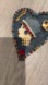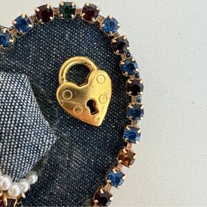 Striking large heart pin brooch with a denim portion with beading and jewels. Lady head is wearing an embellished hat. Some age is evident but overall very cute. Blue, gold, pearl, colorful gems multi-media piece. 3 wide x 3.75 high. Stiff partial backing with some denim exposed on the back. Great with a blue jean jacket or on a lapel. 1 owner- my mom.