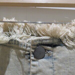 This maxi skirt has a washed denim stretch construction, front and back pockets, a frayed hem and waistline detailing, and a front button closure.