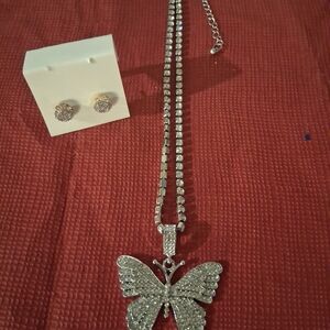 Enhance your style with this dazzling silver butterfly necklace and earring set. Perfect for adding a touch of sparkle to any outfit.