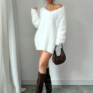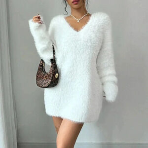 White Casual Women's Solid V-Neck Long Sleeve Knit Sweater