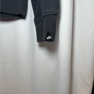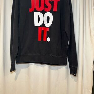 Nike “Just Do It” black crewneck sweatshirt with bold red and white logo lettering on the front. Classic pullover fit with ribbed cuffs and hem. Comfortable and easy to style for everyday wear, streetwear, or athleisure looks.
