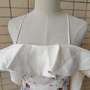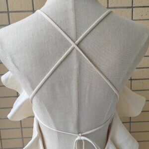 This is a cotton mid-length dress. Its neckline is designed in a right-angle shape and features ruffled decorations. There are cross-shaped shoulder straps at the back, and there are also slit openings on both sides of the skirt. This dress is brand new and genuine.