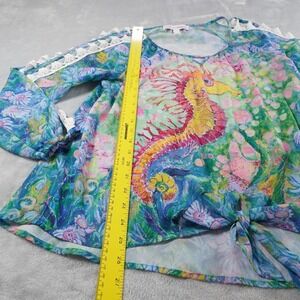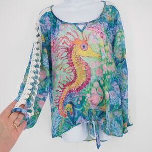 Leoma Lovegrove Womens Blouse L Seahorse Colorful Artsy Split Sleeve Crochet Tie