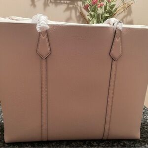 Perry triple-compartment tote bag from TORY BURCH featuring light pink, calf leather, logo stamp to the front, two long top handles and partitioned compartment. Comes in its own bag. I didn’t open everything because it’s brand new and in case someone wanted to give it as a gift. See a picture of it posted in the pictures of what it looks like.