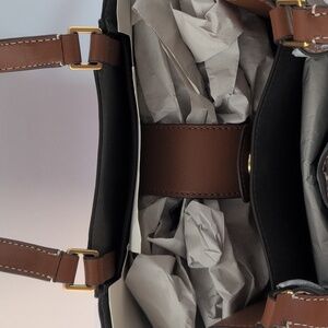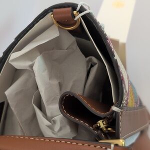 Stylish tote with vibrant patchwork design. Features tan leather and colorful accents. Perfect for any occasion.