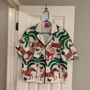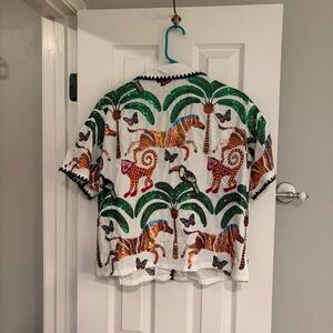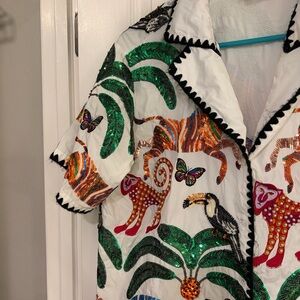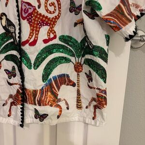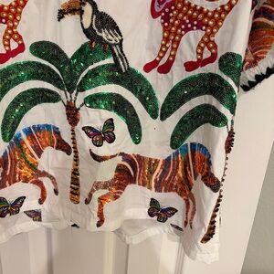 Statement Queen of Sparkles top featuring safari-inspired embroidery with zebras, monkeys, palms, butterflies, and coconuts in sequins and pearls. Minor wear at stitching edges and faint spots near neckline noted.