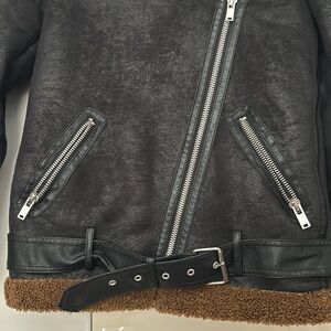 Chic Zara teddy jacket with black exterior. Tan accents add contrast. Features asymmetrical zipper and buckle detail.