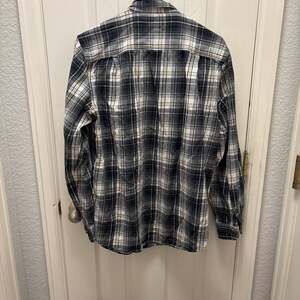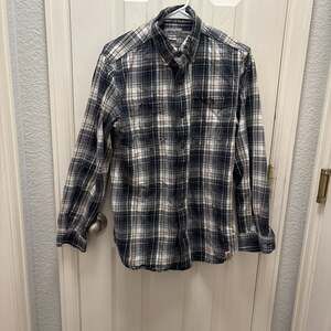 Carhartt Relaxed Fit Plaid Flannel Shirt for men in a versatile gray and orange color scheme, size Medium. This midweight flannel offers comfort and durability for everyday wear. Featuring a classic plaid pattern and a relaxed fit for ease of movement. Excellent pre-owned condition, with no visible stains or damage, perfect for layering or wearing on its own.