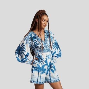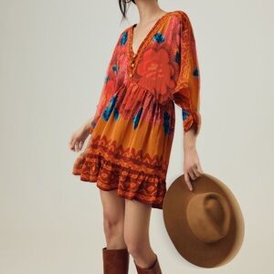 Bold neutral floral motif on a v neck maxi silhouette. Beaded tassels at bodice and dainty scalloped edge sleeves make for a picture perfect maxi!