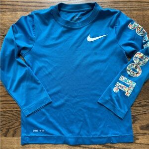 • Blue Nike Dri-Fit long-sleeve tee (M 6–8) – athletic cut, small imperfections on sleeve hem and mild swoosh wear