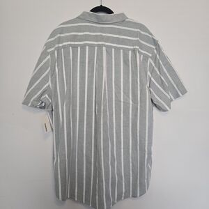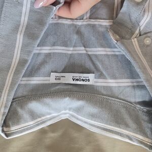 This NWT Sonoma Men's Shirt is a stylish and versatile addition to any man's wardrobe. With a classic striped pattern in a neutral gray color, short sleeves, and a button-down closure, this shirt is perfect for casual occasions during the winter, fall, and spring seasons. Made from comfortable cotton fabric, this shirt is machine washable for easy care and features a collared neckline with a button-down style and pockets for added convenience. Designed in a size 3XL, this big & tall shirt is perfect for men who appreciate a classic yet modern look.