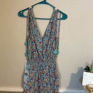 Bebop Boho Floral Sleeveless Romper | Turquoise Blue | Tassel Tie | Size Large