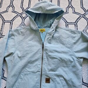 Beautiful light baby blue Golf Wang Tyler the Creator 100% cotton hooded canvas work jacket. Fully lined. Ribbed knit cuffs and waistband. Front outer pockets and an interior pocket. Leather Golf branding patch on front pocket. No flaws noted. New without tags.