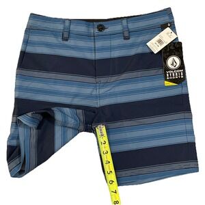 The Volcom Big Youth/Juniors Size 29 Fricken Cross Shred Hybrid Shorts are a stylish and versatile choice for active boys. Featuring a striped pattern and a dark fabric wash, these shorts have a button closure and a mid-rise fit. Made from a blend of polyester and spandex, they offer comfort, stretch, and water-resistant properties, making them perfect for travel, activewear, or casual occasions during the summer and spring seasons. With a 6-inch inseam and easy-care instructions, these hybrid shorts are a reliable option for outdoor activities like beach trips, pools, and camping.
