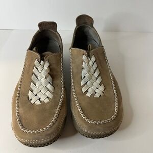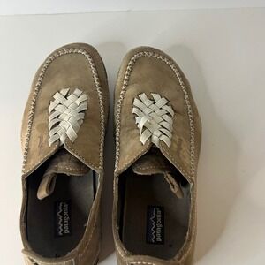Keywords: Patagonia shoes, taupe loafers, womens slip ons, woven detail, contrast stitching, casual shoes, everyday wear, comfortable footwear, performance footwear, outdoor inspired, athleisure
