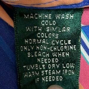Great vibrant variegated stripe crisp cotton shirt that features pointed collar, button front closure, shirttail hem, chest darts, back yoke, and 3/4 sleeves vented sleeves.