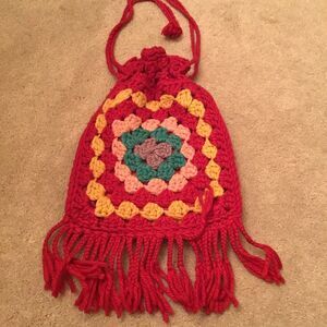 1970's Red Granny Square Handmade Knit Hippie Pouch Handbag