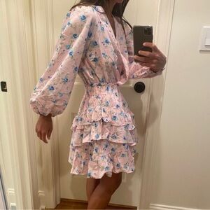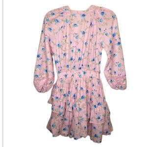 LoveShackFancy x Target Esme mini dress in soft pink floral. V neck. Balloon sleeves. Tiered ruffle skirt. Bust 18” smocked waist 12” length 33”. Excellent preowned condition. Size XS
