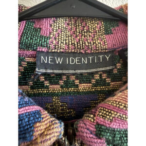 This is a pre-owned women's full-zip jacket by NEW IDENTITY, size L. It features a vibrant, multi-colored geometric pattern in shades of pink, blue, green, and beige. The jacket has a collared neckline and a full-length zipper closure. The fabric tag indicates it is 100% cotton and made in India. The jacket shows minor signs of wear consistent with its pre-owned condition, including some loose threads on the brand tag.