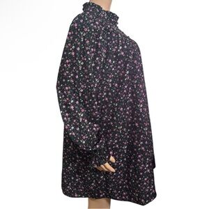 The dress has a ruffled collar neckline, a button detailed placket, and long sleeves with smocked elastic cuffs.