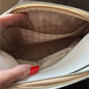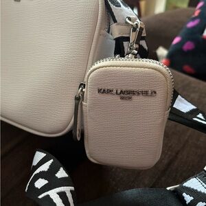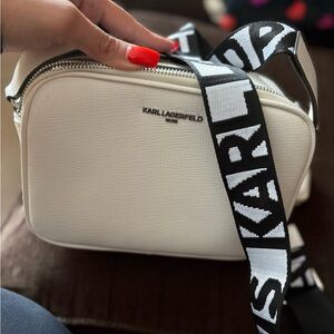 Stylish white crossbody bag by Karl Lagerfeld. Features a striking black and white strap. Ideal for modern fashion. Comes with a coin purse with detachable keychain. The purse has some water mark stains on the back. I tried to remove but was unsuccessful besides that the purse is in great condition.
