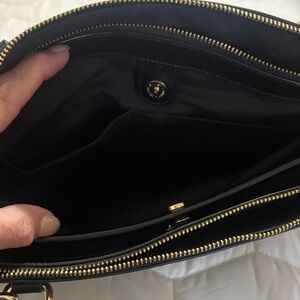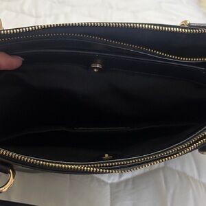 Chic Coach shoulder bag with a black and brown color scheme. Ideal for everyday use. 14”w at bottom 12”h x 3.5”w