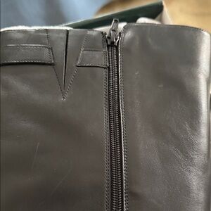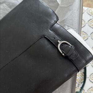 Brand new, with tags, in original box with carry handle! Beautiful black leather boots from Ralph Lauren, "Margarite," with a 1" heel and non-slip outer soles, size zip with vent at the top, and signature pewter stirrup details at ankle and top of calf. Nylon interior as noted in photos.
