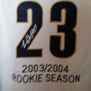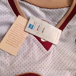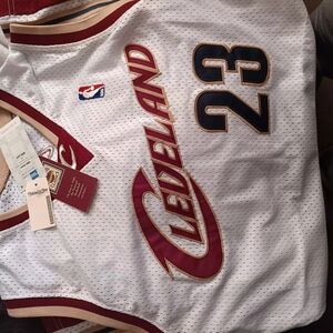 Authentic NBA Throw Back Hardwood Classic Mitchell & Ness rookie season LeBron James Jersey with simulated signature embroidered on the number 2 in back all numbers and signs are stiched, the Jersey is white with maroon accents. Features Cleveland Cavaliers team logo. The size of the jersey is 52.