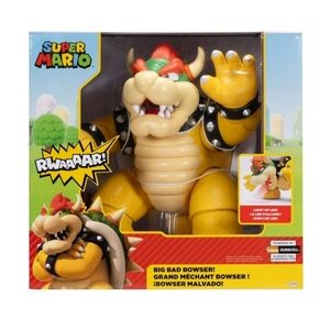 Super Mario Big Bad Bowser action figure. New in box. Sealed. Features vibrant colors and detailed design. Perfect for collectors and fans. It stands approximately 12 inches tall. The figure features a "fire-breathing" light effect from its mouth and has over 15 sounds and music from the Super Mario games. It has 13 points of articulation for posing and activating sounds. Arm slashing action! The toy is powered by Duracell batteries. #super #mario #bowser #action #figure #new #supermario #lighted #sounds #songs #big #bad #toys #kids #play #fun