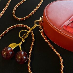 Chic and stylish heart-shaped red corset ribboned crossbody bag in vibrant red with included sparkle cherries bag charm. Perfect for adding a pop of color to any outfit. Dimensions in pictures. New with tags! A second cherry bag charm is listed separately.