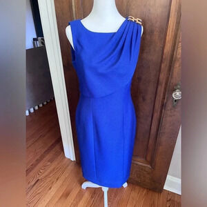 Kay Unger Blue Sheath Dress Gold Shoulder Accent Women Size 6