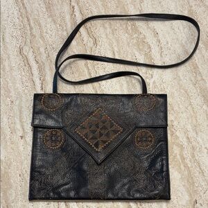 Measurements are 9 1/2β top to bottom, 10β side to side and 3β front to back. She has a very spacious interior with one side pocket. She has one large exterior zippered side pocket. Her shoulder strap is adjustable. There are absolutely no wear marks on her yellow pebbled leather and no rips, tears, stains or odors in her dark brown interior. What a beautiful bag!